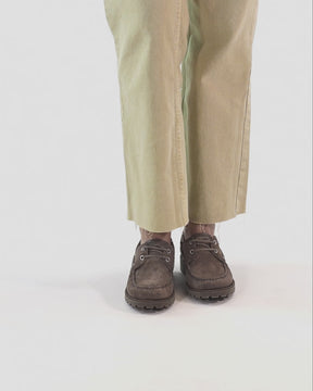 Lady Boat Shoe. Suede in pebble-grey. Lace-up Closure. Leather lining. Removable anatomical leather insole. Natural, flexible and durable rubber sole. Heel height: 4 cm. 100% Made in Spain.