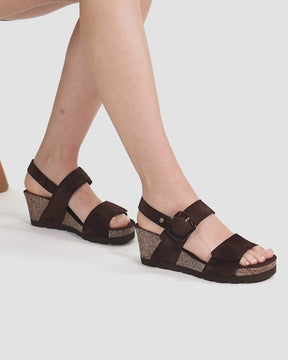 Wedge sandals. Brown Velour Leather. Velcro Closure. Leather lining. Anatomical insole. Lightweight, flexible, strong cork and EVA rubber sole. Heel height: 6.5 cm. 100% Made in Spain.